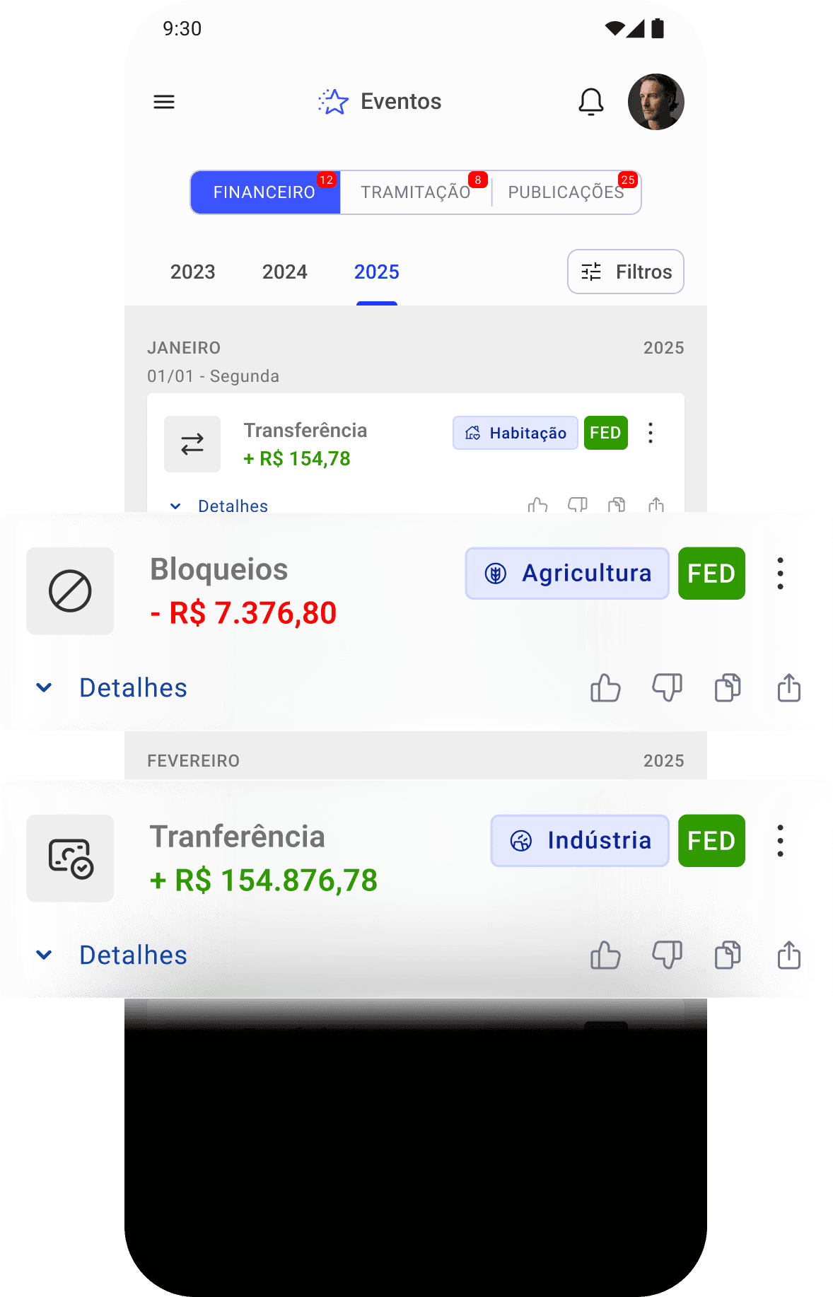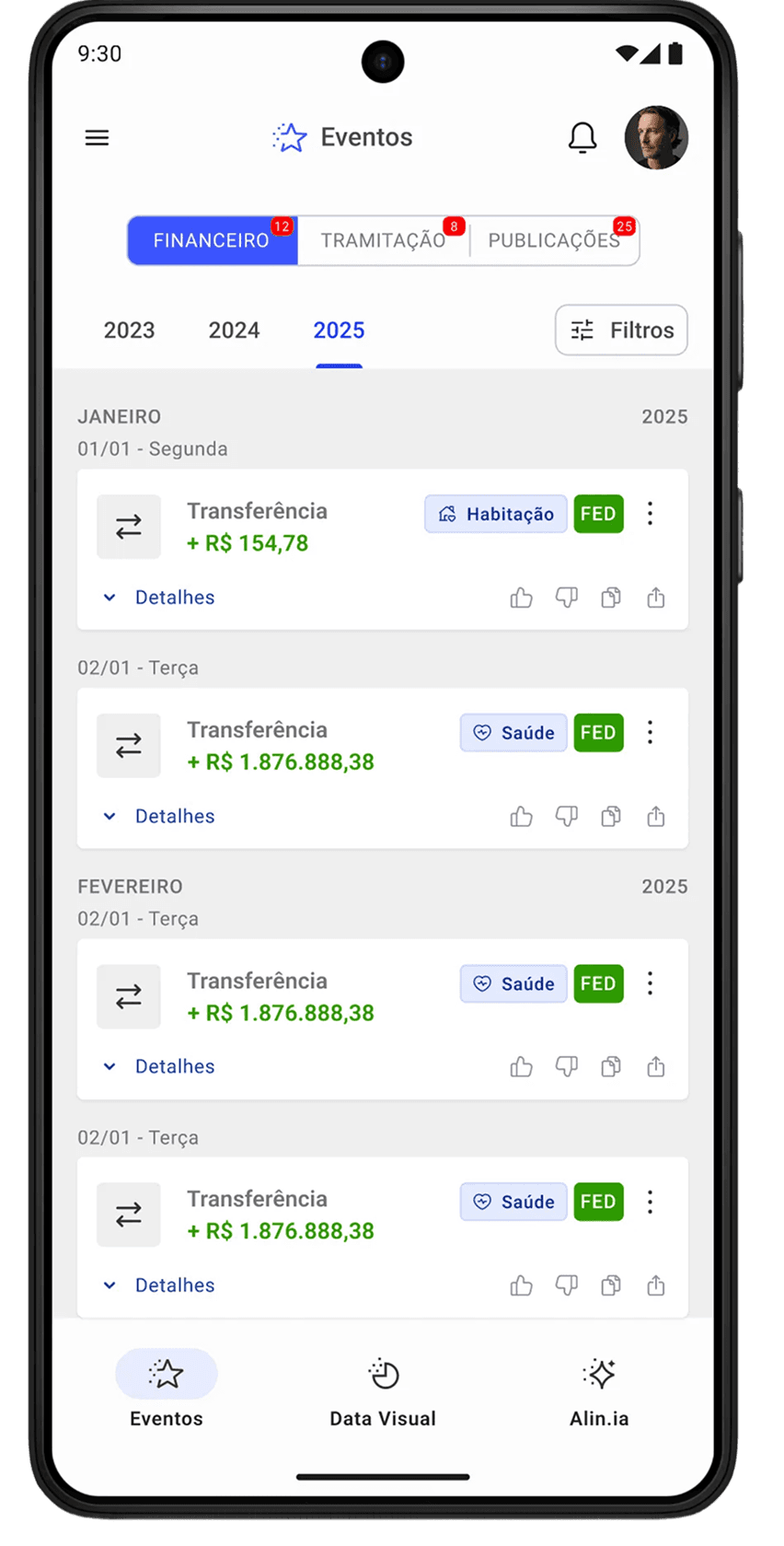 Timeline com visibilidades das principais transações relacionadas a sua gestão.